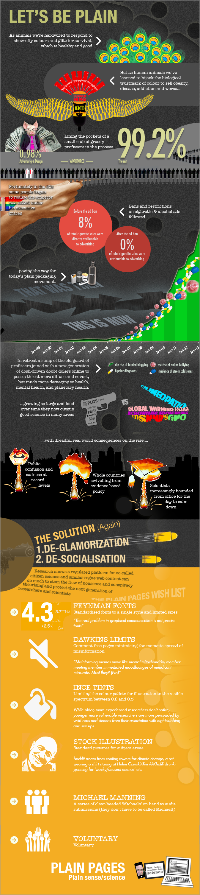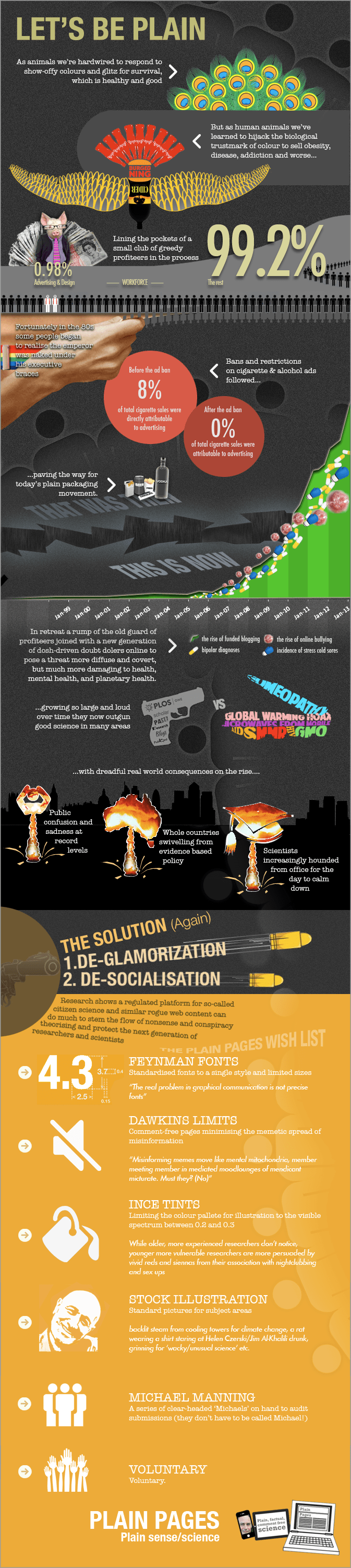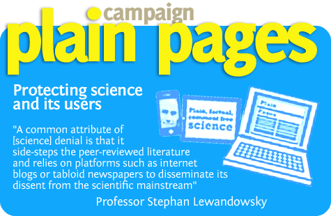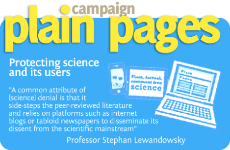 There is at present a tug-of-war raging online between evidence and ideology with truth the loser. Pitted against privately loud and colourful voices of science denial, quiet public science rarely gets a shout, jeopardising rational discourse and policy-making. With a single, regulated platform for professional and citizen publishing we can change this. A voluntary scheme of plain pages would significantly reduce the ability of loud and colourful privately-funded voices to drown out bias-free public science. Plain fact will take centre stage. You can help make this platform the gold standard for science communication: please read our infographic below and share it with as many friends and colleagues as possible, and sign up.