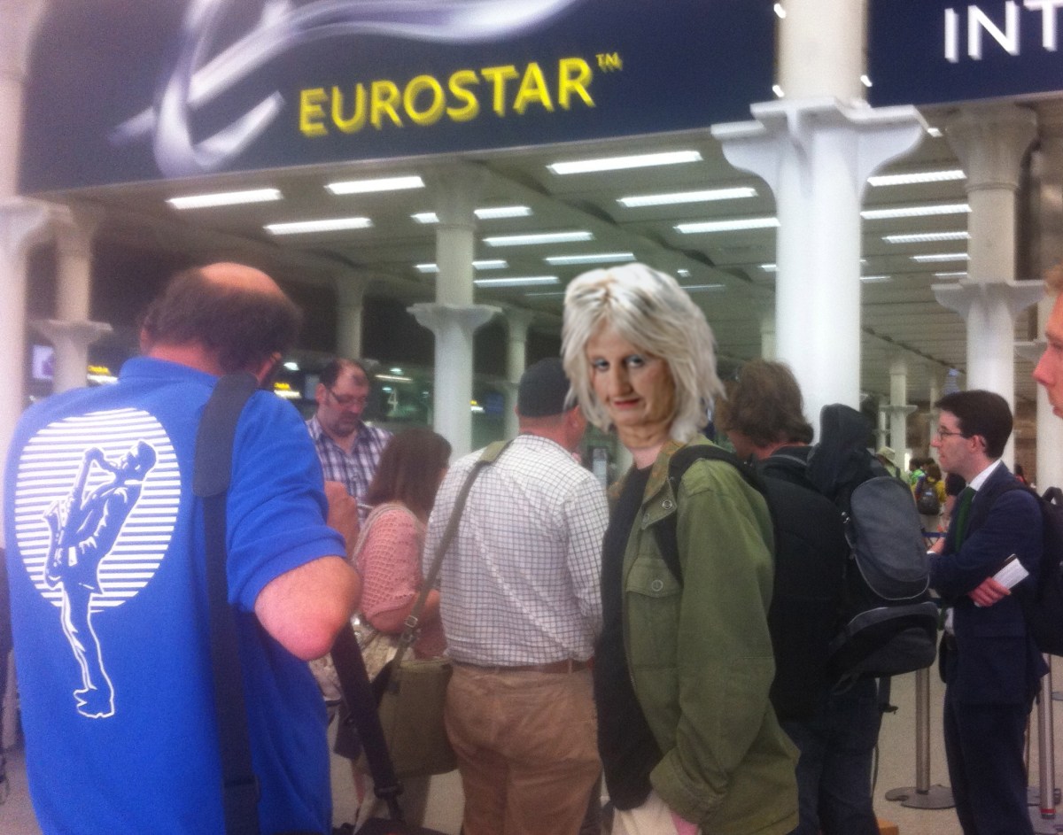 15.05.14 Members of LFG gather at Euston’s Eurostar station, complete with rubber oldie masks, ready for a day of solidarity and protest at the headquarters of the Welsh Assembly, Cardiff. The aim was to show support for the assembly’s health plans, specifically e-cigarette regulation and make as many assembly members as possible aware of our ‘Shakin Vapin’ campaign to add small jumping bean motors to the devices to make users look like they’re decrepit. E-cigarettes are renormalising smoking in a way that has worrying consequences for children and police officers/bar staff.