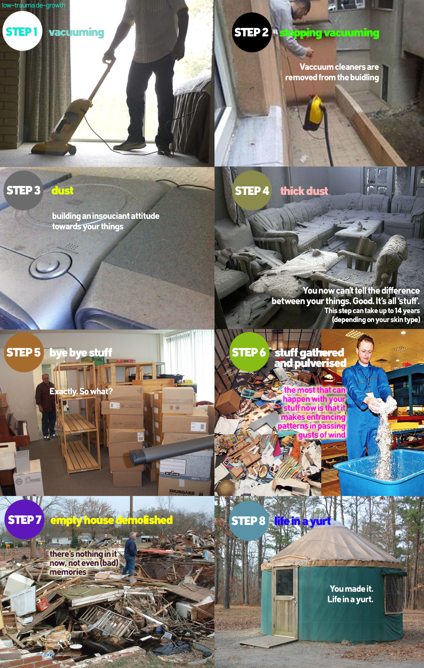 Having lots of stuff (stuffitis, thingcer, Munchausen syndrome by boxes) is the surest way we know to kill the planet. Along with Craig and his team, LFG began workshops on de-growth in 2006 which, as popularity of the courses grew, slowly evolved into comprehensive programmes that saw ordinary people leave their demolished homes for a new life in a yurt. Below is a page from the brochure (with input from LFG) that greeted successful de-growthers in their new sustainable homes: